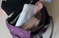 内部の布は縫い目と同じ紫色で、持ち歩くのがとても楽しそう。