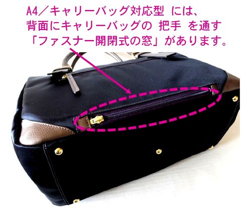 ・持ち手は根革と金具のカンで取り付け⇒ A4バッグ収納の際、持ち手の収まりが良い。